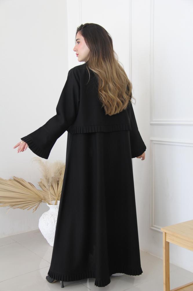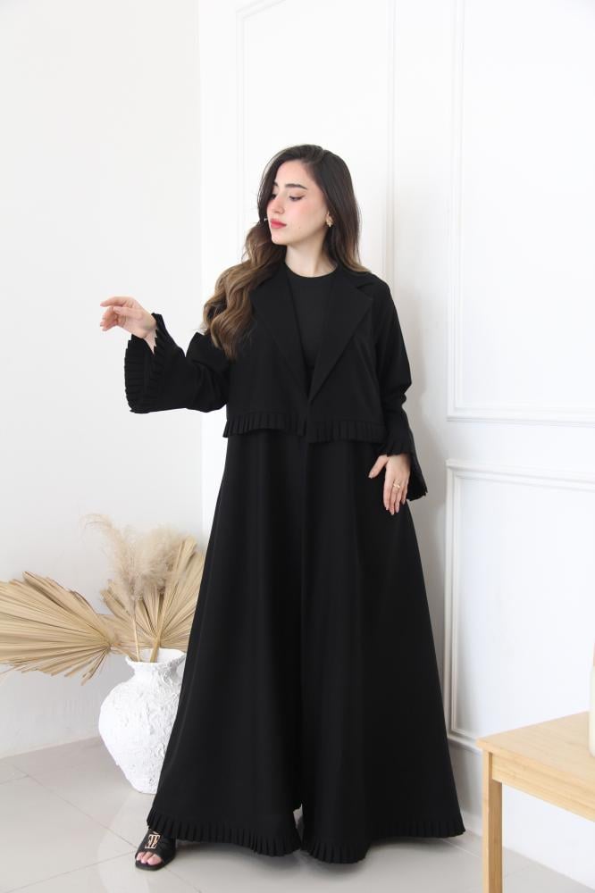 • التفاصيل: مزينة بثنيات أنيقة على أطراف الأكمام، الجاكيت، وحافة العباية، مما يضفي لمسة فخامة.